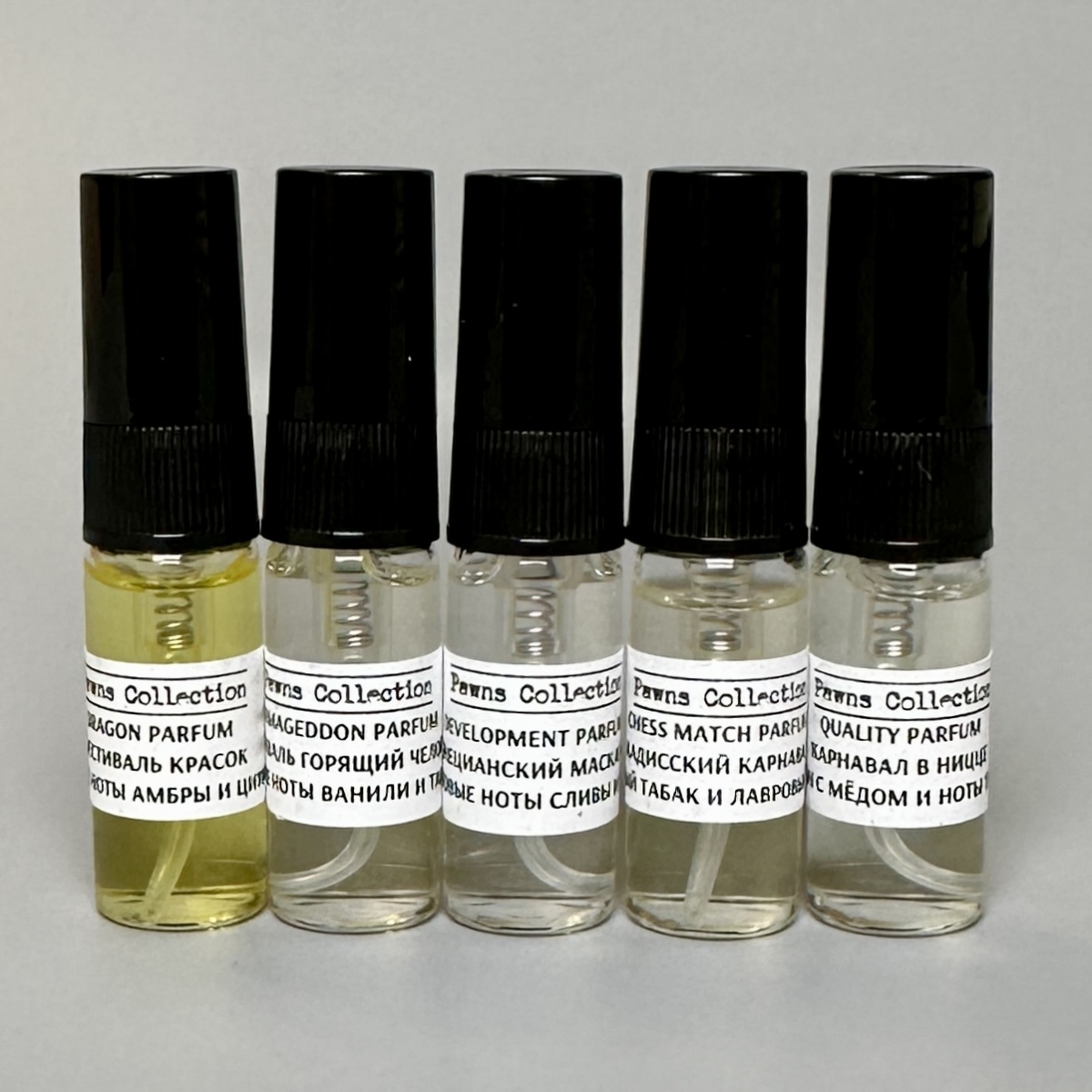 Набор рум–спрея Пудровые ноты амбры и цитрусов 2 мл Терпкие ноты ванили и табака 2 мл Фруктовые сладкие ноты сливы и амбры 2 мл Пряные ноты табака и лаврового листа 2 мл Ноты бурбона с мёдом и табака 2 мл